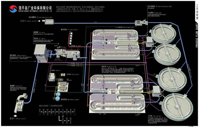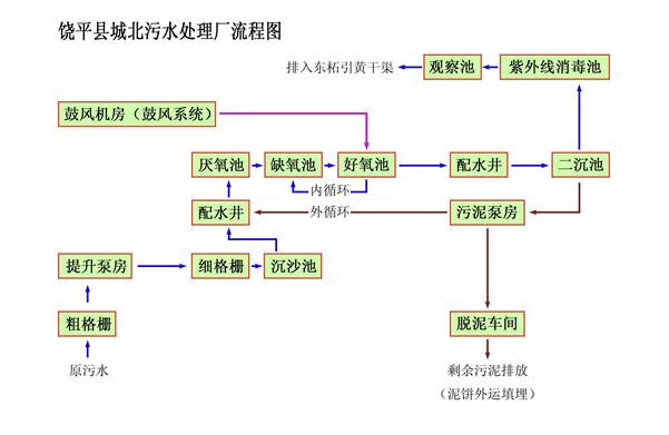 饒平縣城北污水處理廠項目由廣東省廣業(yè)環(huán)保產(chǎn)業(yè)集團有限公司和廣東省環(huán)境工程裝備總公司負責(zé)建設(shè)、運營。項目選址在東柘引黃干渠與324國道復(fù)線相交處,東柘干渠南岸,廠區(qū)占地面積53.1,近期服務(wù)面積約5.5平方公里,服務(wù)人口約9.0萬人,遠期服務(wù)面積約7.8平方公里,服務(wù)人口約11萬人。分一二期建設(shè),一二期建設(shè)為日處理污水2萬噸,城北污水處理廠首期工程于2010年3月17日進入試運行生產(chǎn),5月31日通過環(huán)保驗收并于6月1日進入正式運營。二期工程于2015年4月1日通過環(huán)保驗收,并于4月16日進入正式運營。目前該廠保持持續(xù)、穩(wěn)定正常運行,其中2016年處理污水量約1205萬噸。工藝流程圖如下: