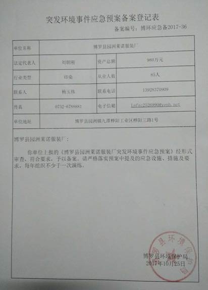 已制訂《博羅縣園洲萊諾服裝廠突發(fā)環(huán)境事件應(yīng)急預(yù)案》,并于2017年 10月25日在博羅縣環(huán)境保護(hù)局備案,