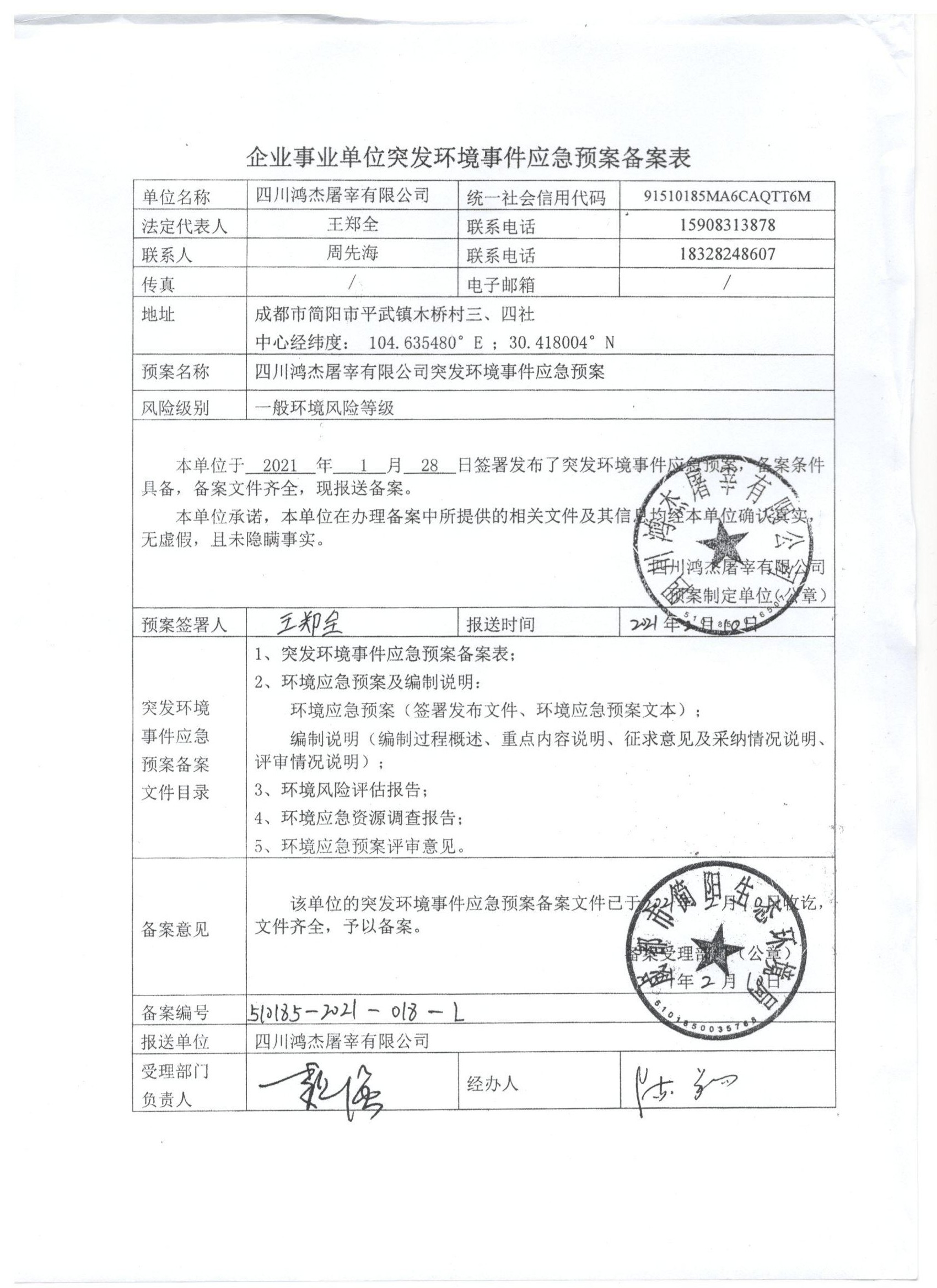 已制訂《四川鴻杰屠宰有限公司突發(fā)環(huán)境事件應(yīng)急預(yù)案》,并于2021年 2月 12日在成都市簡陽生態(tài)環(huán)境局備案, 備案編號:510185-2021-018-L 附件鏈接: 《四川鴻杰屠宰有限公司突發(fā)環(huán)境事件應(yīng)急預(yù)案》電子版(點(diǎn)擊打開); |